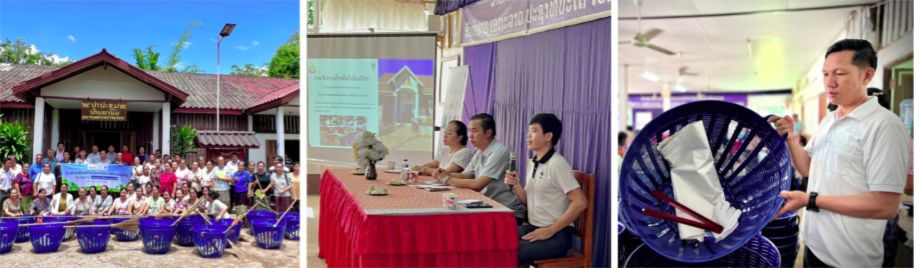 The event was held on 9 August 2025 in Ban Phanom, in collaboration with WWF-Laos’ Plastic Waste Reduction Project, the Office of Urban Management and Services, the Environment Office, and Ban Phanom Municipality. The village head of Ban Phanom, along with representatives of 150 families, received equipment to support community-based waste managementt, including: bins, brooms, litter pickers such as tongs, face masks, waste-segregation logbooks and other materials.