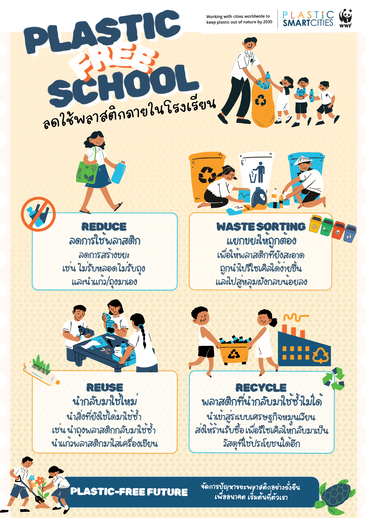 - Place this poster in schools to encourage staff and students to reduce their plastic usage and improve campus waste management.